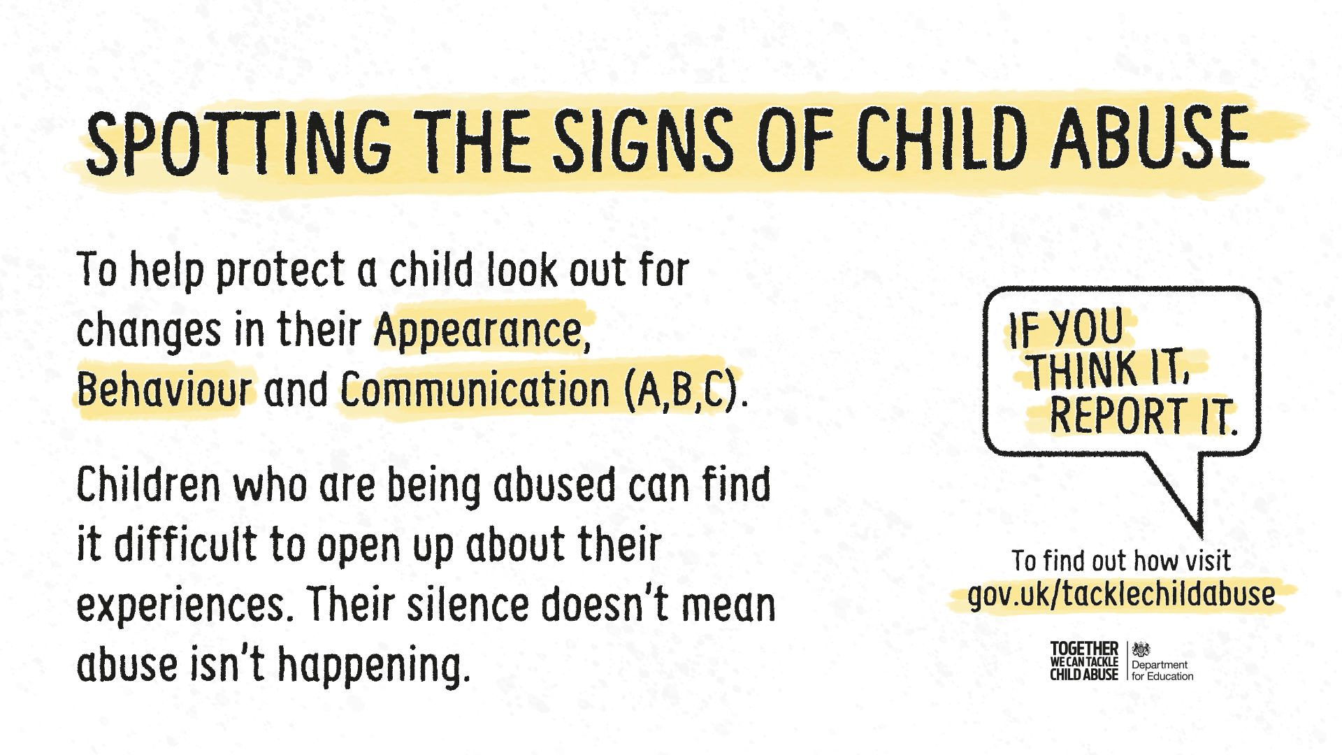 Last year nearly 400,000 children in England were supported because someone noticed they needed help. To help protect a child or young person look out for changes in their Appearance, Behaviour and Communication (A B C).