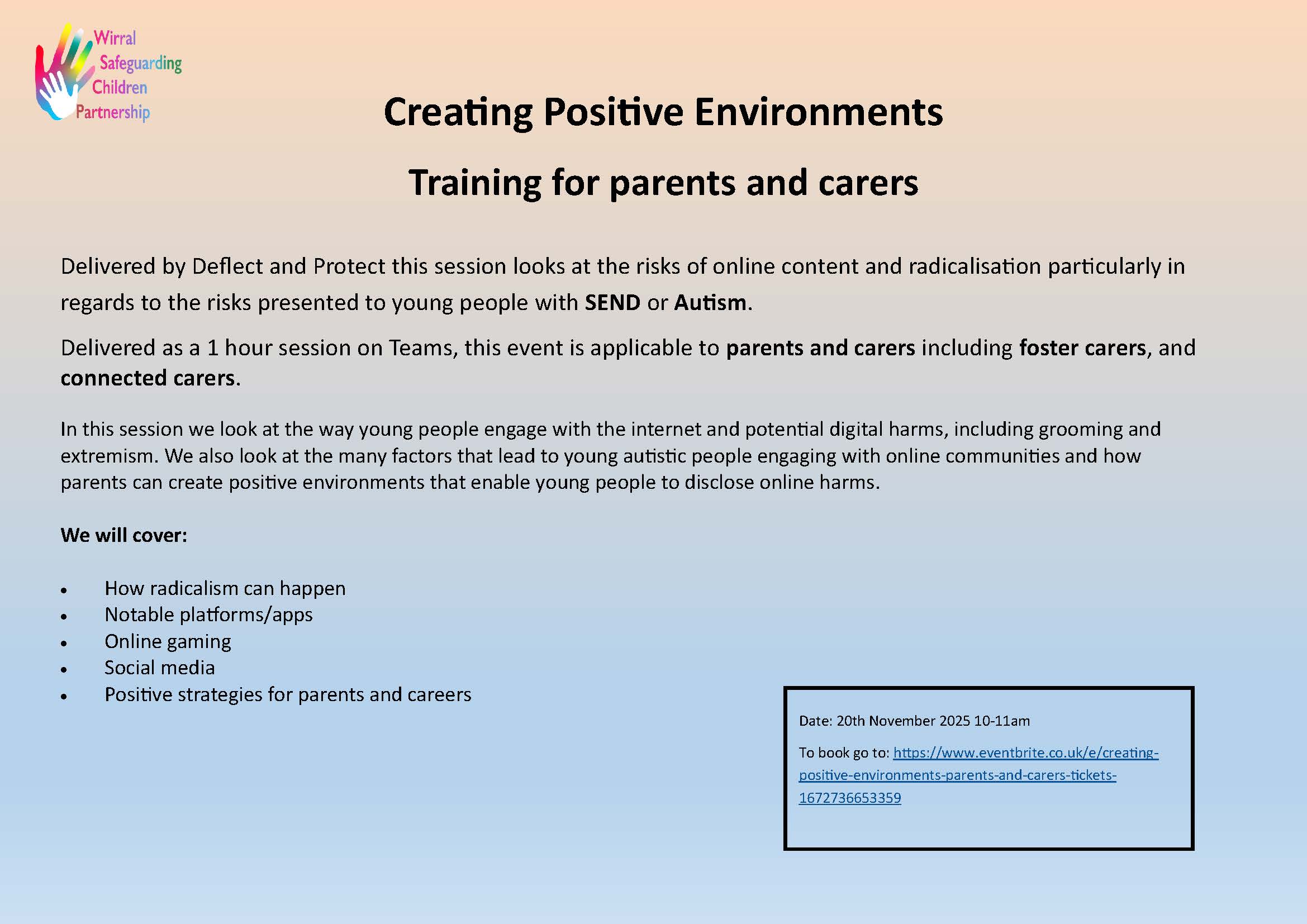 We are pleased to be able to offer FREE training for parents and carers around online risks of radicalisation, which is aimed specifically for parents/cares of children with SEND.